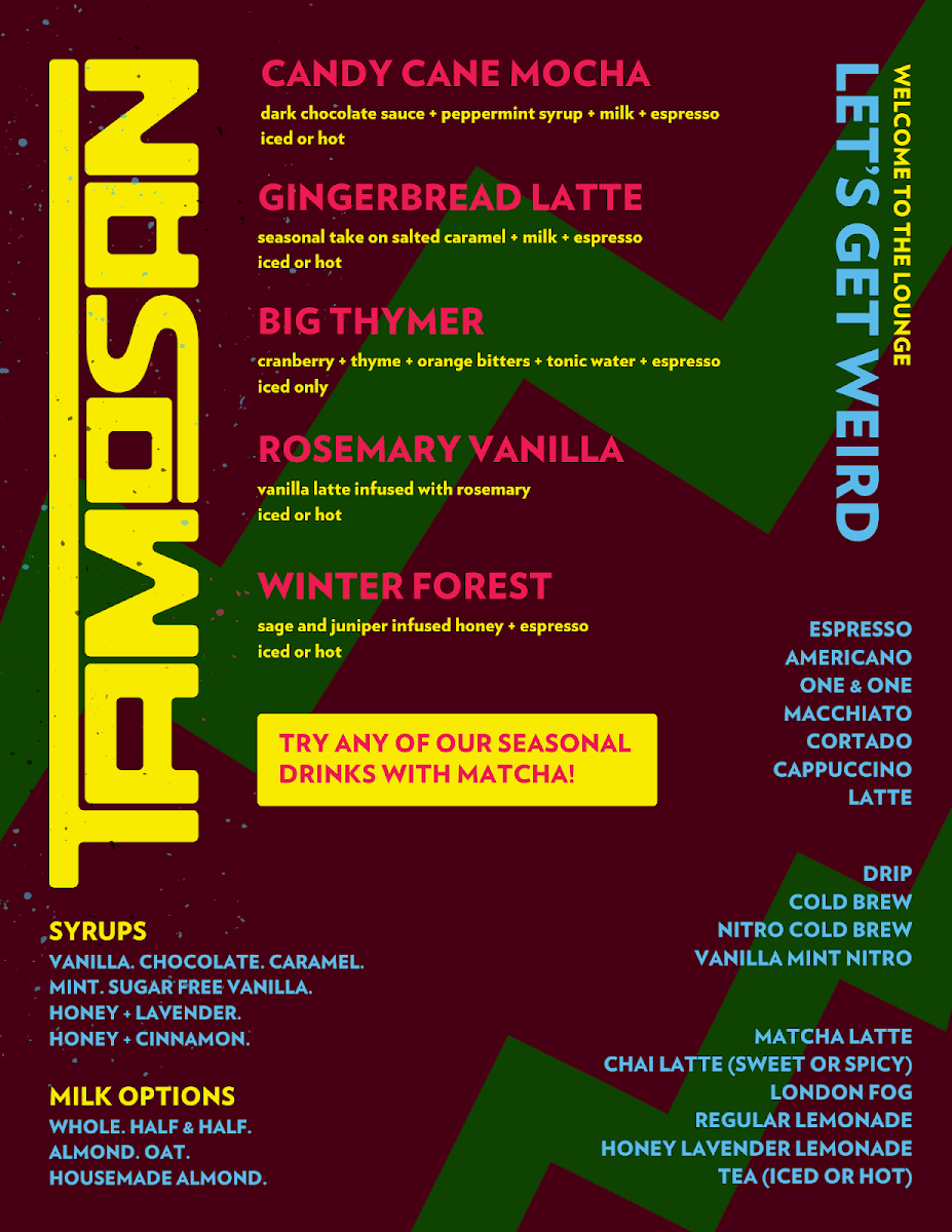 The menu at Tamosan Coffee Lounge reflects a thoughtful balance between classic café offerings and carefully crafted specialty drinks. It’s a simple, approachable selection designed to complement the relaxed, inviting atmosphere of the space.